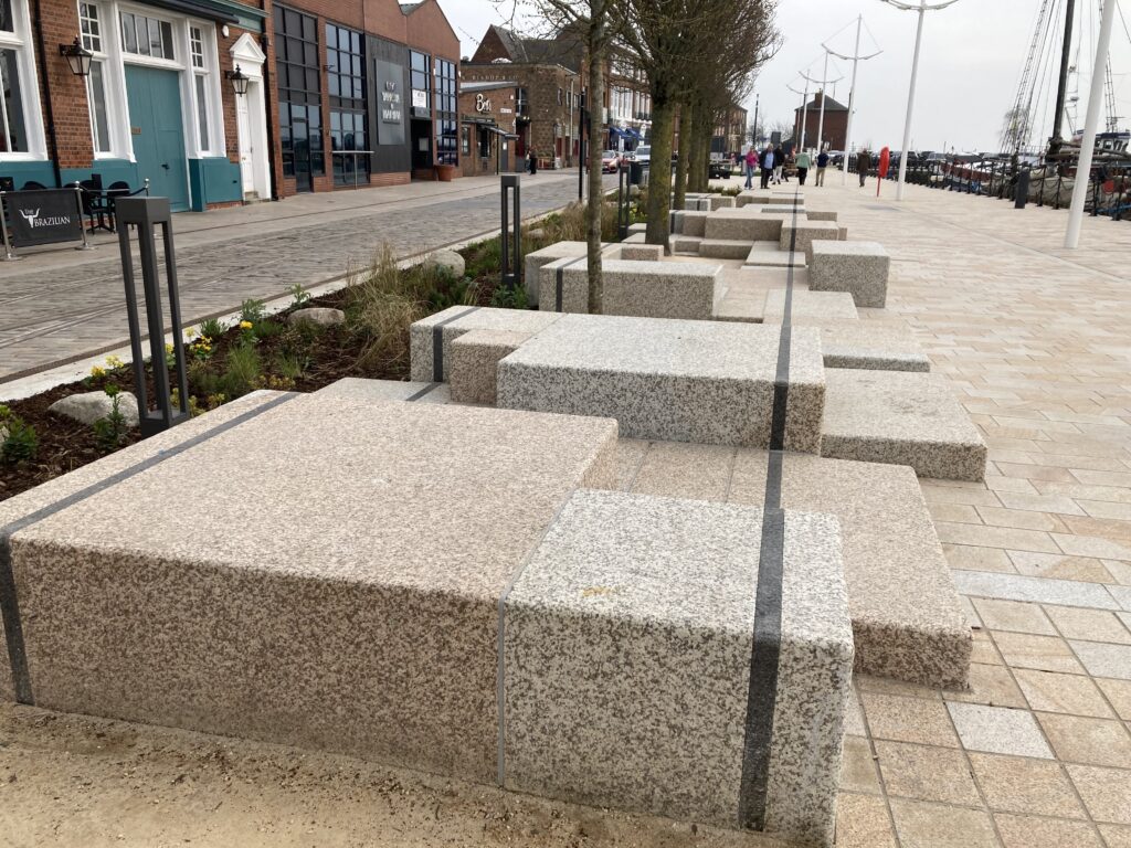The concept of introducing play in new urban design was first tried in Hull as part of the city centre public realm works ahead of the 2017 City of Culture with the installation of the walk-through fountains in Queen Victoria Square. A decade later, the LDA team has taken play to a new level with Minecraft-style granite blocks set along the route of the Old Town Walls. They’re seats but they’re also mini-climbing challenges for little kids while they also incorporate lines marking where the walls once stood. The modern building blocks are also a playful nod to the historic brick defences. The lines of the old walls were there before but now they include an extension mapping out the footprint of the former Hessle Gate entrance to the town.